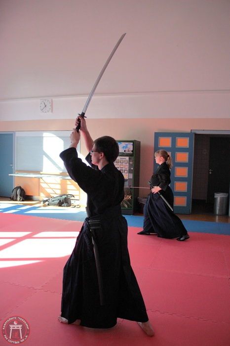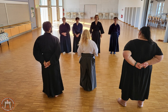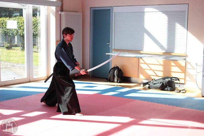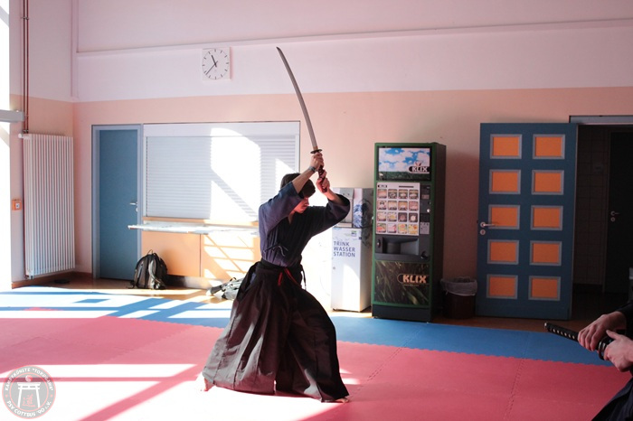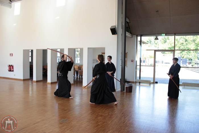 den Wächtersitz, welcher in der sogenannten Tatehiza-Serie (eine Auswahl sitzender Kata für fortgeschrittene Schüler sowie für Meister) zur Anwendung kommt. Während man im Nebengelass also mit den Wettkampfvorbereitungen sowie dem fordernden Inhalt des Iaido-Trainings beschäftigt war, wurde auch in der Haupthalle überaus fleißig trainiert.