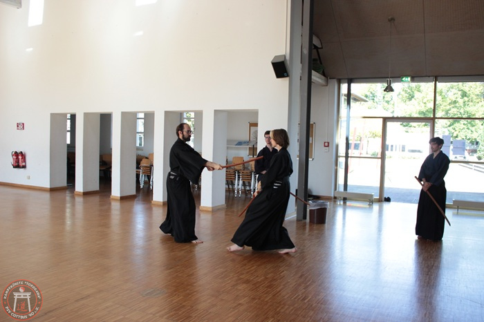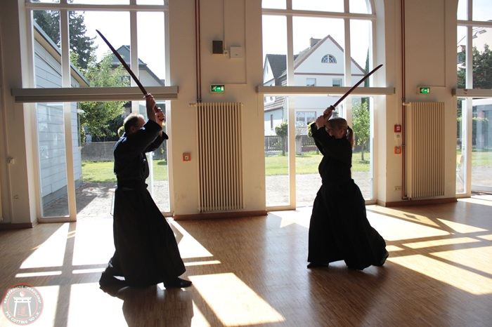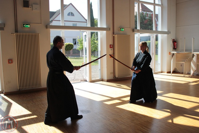 Ebenfalls im Nebengelass hat an diesem Wochenende durchgängig das Training für Iaido stattgefunden. Schwerpunkte waren hier unter anderem Anwendungen mit dem Bokken (Holzschwert) und der Geschwindigkeitsaufbau bei Kata. Darüber hinaus sind aber auch fordernde Inhalte – wie spezielle Techniken – abverlangt worden. So trainierte man unter anderem