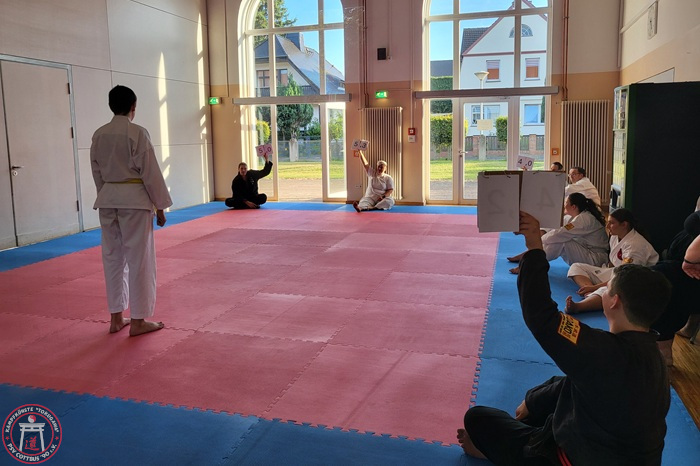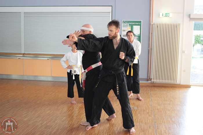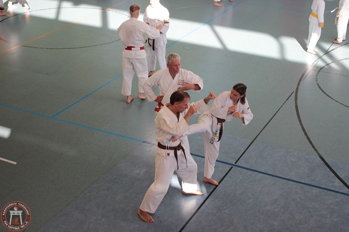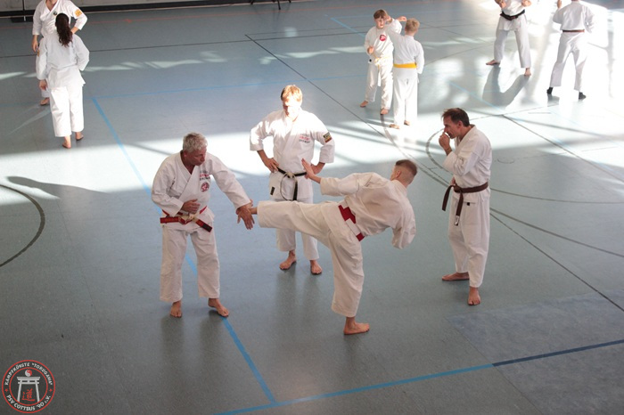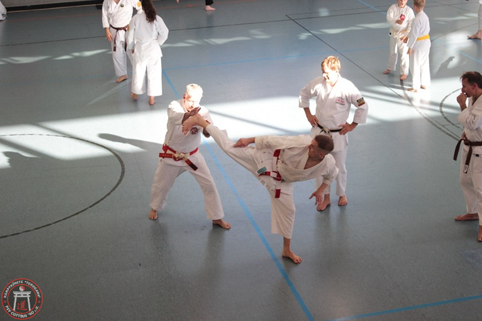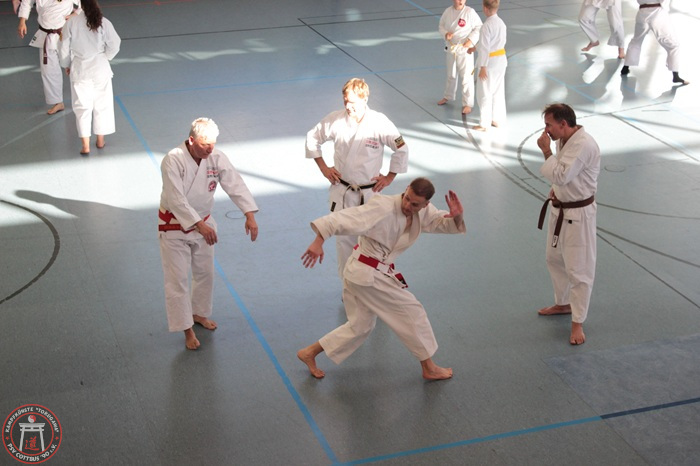 Erwärmung standen Kumite sowie Ippon und Kempo-Kumite auf dem Trainingsplan. Am Nachmittag ist die große Gruppe der Teilnehmern dann in 3 kleinere Gruppen aufgeteilt worden. Während sich Prüflinge unter den kritischen Augen und hilfreichen Tipps von Sensei Naß auf ihre bevorstehenden Prüfung vorbereiteten, welche am folgenden Wochenende