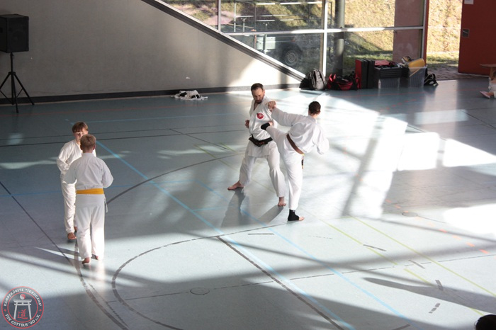 sind auch anspruchsvollere Partnerübungen in festgelegter, aber auch in freier Form durchgeführt worden. Hierbei wird nicht nur großer Wert auf die saubere Ausführung, sondern auch auf den richtigen Abstand zum Partner geachtet, damit die geübten Techniken entsprechend wirken können.