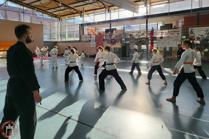 auch noch jede Menge frische Luft und Sonnenschein, um Kihon-Grundlagen im Schrittdiagramm und Formen-Training durchzuführen. Nach der Mittagspause wurde das Training dann in die frisch renovierte Halle der Anlage verlegt, in der am Vorabend noch Trainer und fleißige Helfer der Mattenboden vorbereitet haben. Nach einer kurzen