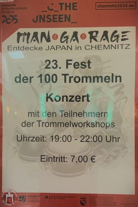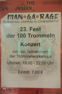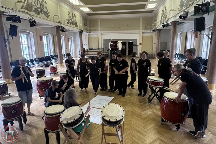 Tun. Steffi und ihr Fahrer (Insider) sind eingeladen, am 23. Fest der 100 Trommeln in Chemnitz bei Hibiki Daiko teilzunehmen. Und natürlich ein neues Stück zu lernen. Das übte besagte Lilo mit dem fortgeschrittenen Kurs, Leute von drei Dojo´s Hibiki Daiko, Akaishi Daiko und uns,